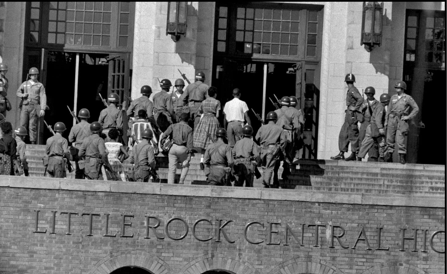 Needless to say Faubus was brought to heel and the Arkansas Nine entered without physical harm the next day. There was a large white crowd, but they held themselves in check this time, no doubt after a careful consideration and then abandonment of their previous motives for keeping Negro children out. It was curious, but the picture below perhaps shows the "assistance" they were given in re-thinking their ideas on race.