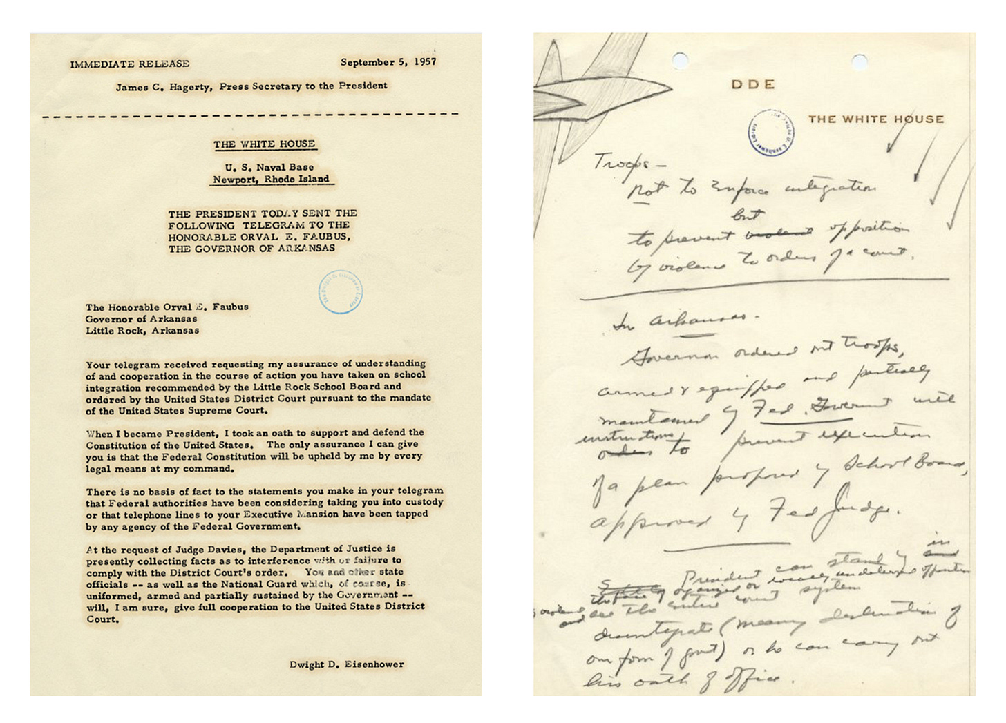 Eisenhower was enraged. He called in his Defense Secretary and asked him how long it would take to get the best division for riot control to Little Rock. Charles Erwin Wilson, who had been following the crisis closely, smiled broadly and replied that it could be done in a day. Eisenhower immediately sent out an order which a) federalized the Arkansas National Guard and b) ordered 1000 National Guard troops to Little Rock.