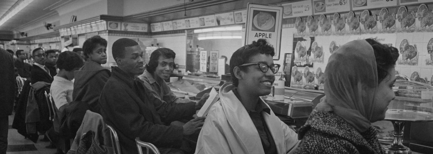 It was an astonishing lesson to their elders, who were wrapped up in theory and severe political in-fighting by this point, and were fast losing their ability to act. The sustained drive towards integration was kick-started. It would be long and bloody. The smiles you see below were seldom seen thereafter on the faces of African American activists and their idealistic white counterparts, as they confronted the worst of human nature, and endured it without responding in kind.